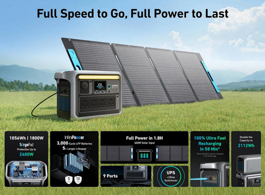 Anker SOLIX C1000 Longest-lasting 10-year lifespan with Anker’s Proprietary InfiniPower™Technology. Recharge the portable power station from 0 to 80% in just 1.4 hours.Power up to 10 devices at once with 2400W access 10 Ports. Power high-wattage devices up to 3600W. Smart App Energy Control for key portable power station information. 5-Year full-device warranty for a worry-free experience.